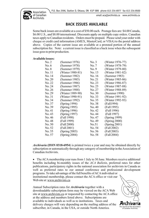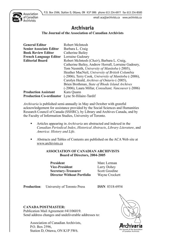 Archivaria is published semi-annually in spring and fall with grateful acknowledgement for assistance provided by the Social Sciences and Humanities Research Council of Canada (SSHRC) and Queen's University.